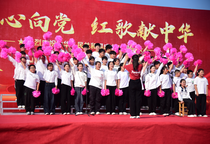 杨杙校长致词后,各班级学生依次登台,以饱满的精神状态唱响红色经典。《歌唱祖国》、《没有共产党就没有新中国》、《我和我的祖国》,一首首耳熟能详的红色歌曲深情地诉说着对祖国的眷恋,同学们的精彩表现赢得阵阵掌声。