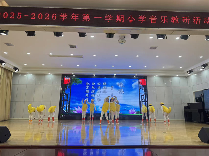 活动伊始,黄莉老师带来戏曲专题讲座,围绕戏曲文化与小学音乐教学融合展开,结合教学实例讲解戏曲元素的课堂渗透方法,为教师们拓宽教学思路。随后,学生们接续登场,先后表演经典曲目《悯农》与《咏鹅》,灵动的动作与清脆的歌声将古诗意境具象化,展现出扎实的音乐素养与表现力。紧接着,黄莉老师带领学校音乐社团成员演绎黄梅戏《女驸马》选段,婉转唱腔与生动表演赢得全场掌声,让老师们直观感受戏曲艺术魅力,现场氛围持续升温。
