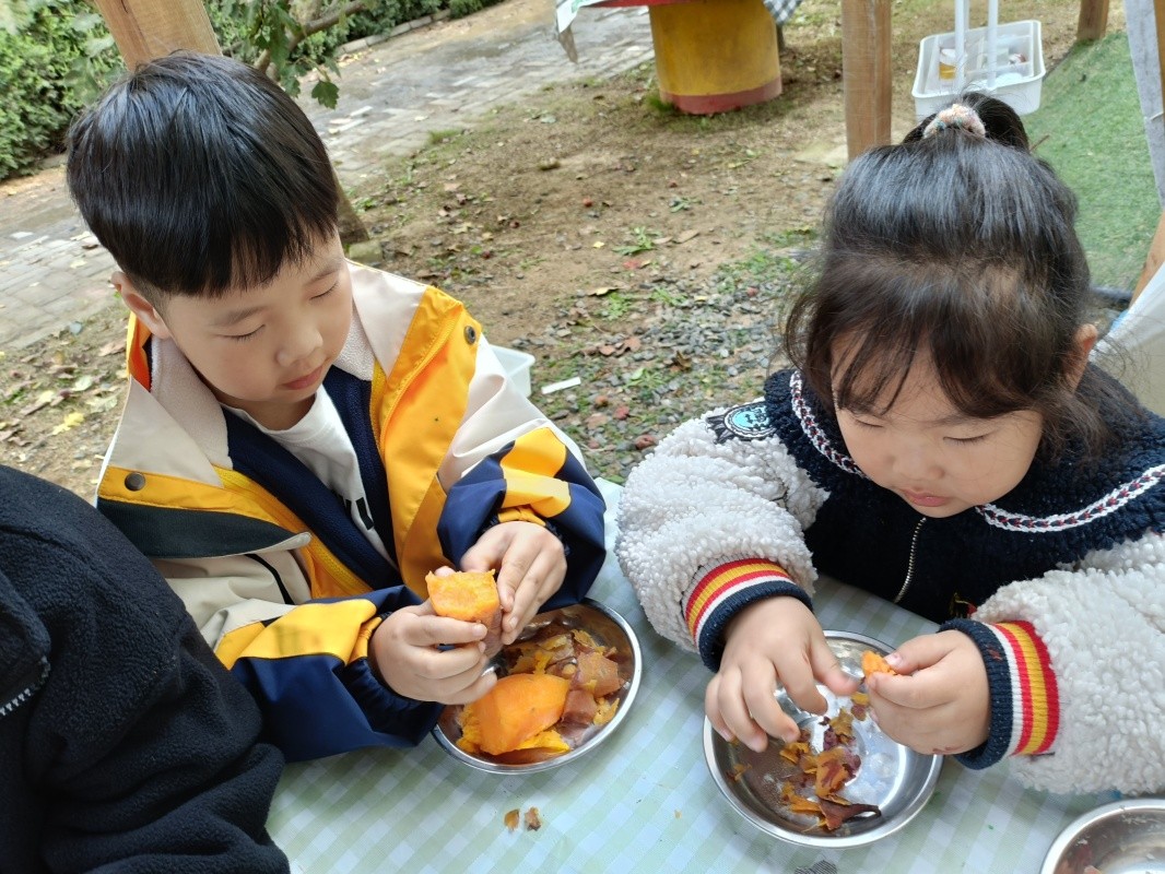 孩子们捧着热乎乎的红薯和玉米,你一口我一口分享着,老师与孩子们围坐在桌旁,一同品尝亲手制作的红薯和玉米,孩子们吃得满脸幸福。这个立冬,小院里的欢声笑语和食物的香甜,成了孩子们最温暖的冬日记忆。