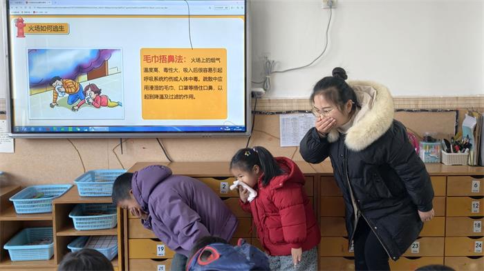 活动前期,幼儿园组织教职工开展消防桌面推演,详细梳理了火灾报警、初期灭火处置、疏散引导、医疗救护等关键环节,明确各岗位职责分工,优化疏散路线与应急预案,为实战演练筑牢基础。各班级根据幼儿年龄特点,通过消防动画、知识卡片、情景模拟等形式,让孩子们认识消防车、灭火器等消防器材;牢记“119火警电话”“不玩火、不摸电器”等安全常识 ;练习“湿毛巾捂口鼻、弯腰贴墙走”的逃生动作。将抽象的安全知识变成孩子能上手的小技能,让孩子在轻松的互动中学会安全自护。