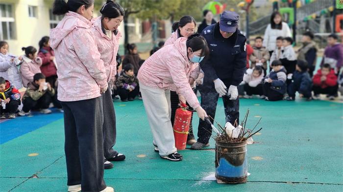 疏散演练结束后,幼儿园安保人员现场开展灭火器实操培训。通过“一提、二拔、三握、四压”的通俗口诀,详细讲解了灭火器的正确使用方法,并点燃模拟火盆进行演示。随后,教师和幼儿依次上场实操,直观感受灭火过程。陈芹园长对本次演练进行了总结,再次强调逃生注意事项。