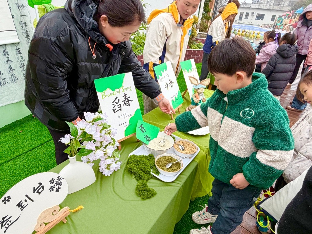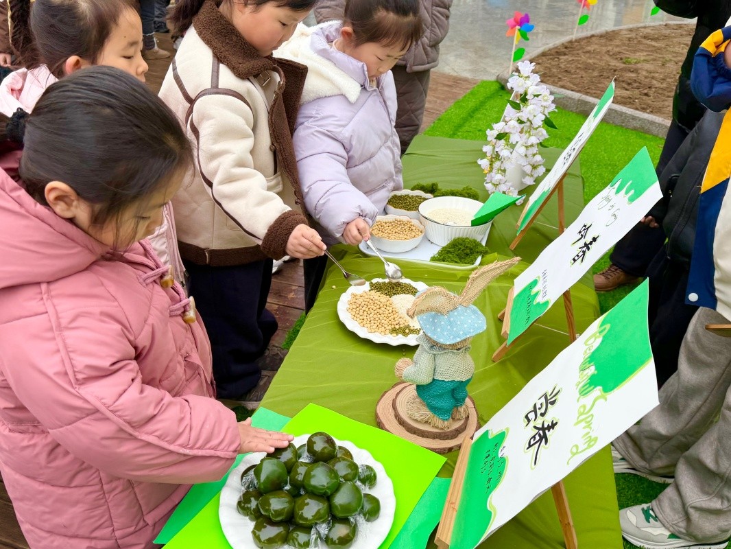 “舀春”体验区热闹开启,孩子们手持小勺,小心翼翼地舀起象征丰收与希望的“白家米”,专注的神情中满是对新学期的期待;“尝春”摊位前,孩子们好奇的伸手触摸、细细品尝,清香的绿豆糕、软糯的青团,让孩子们品味到了春天的味道,感受着传统食俗的魅力;“听春”环节,孩子们侧耳倾听鸟鸣与风声,树上的风铃声,用感官捕捉着春天的脚步。
